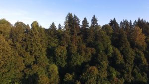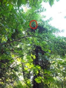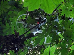 So I basically headed in the direction I thought the drone was heading for and bushwhacked through this forest, that was mainly ivy, ferns, maples (I think) and fir trees, it was pretty steep and there are springs in there also, which I didn’t realize before but was now discovering are mosquito breeding grounds, and I was getting swarmed, but still I pushed onward. At one point I stopped and figured I was never going to find it, but once I stopped I heard a faint whirring noise, it was my drone’s propellers still spinning, so I was psyched and followed the propeller noise but to my dismay I soon found my drone stuck 65 feet up an ivy covered tree, in a dense forest canopy.