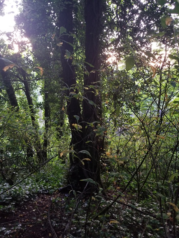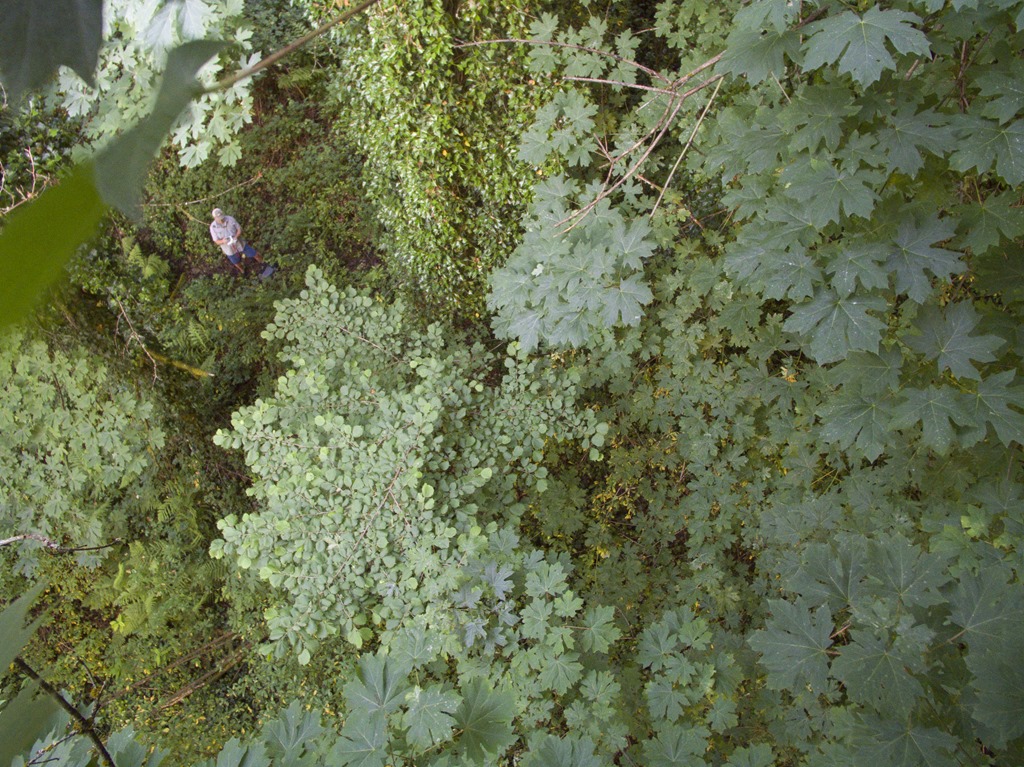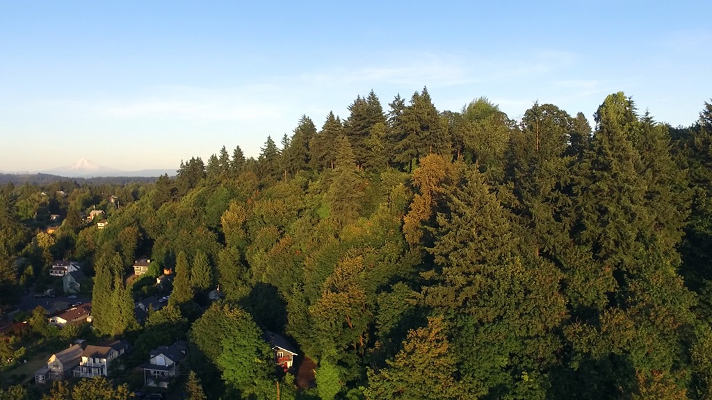 So I basically headed in the direction I thought the drone was heading for and bushwhacked through this forest, that was mainly ivy, ferns, maples (I think) and fir trees, it was pretty steep and there are springs in there also, which I didn’t realize before but was now discovering are mosquito breeding grounds, and I was getting swarmed, but still I pushed onward. At one point I stopped and figured I was never going to find it, but once I stopped I heard a faint whirring noise, it was my drone’s propellers still spinning, so I was psyched and followed the propeller noise but to my dismay I soon found my drone stuck 65 feet up an ivy covered tree, in a dense forest canopy.