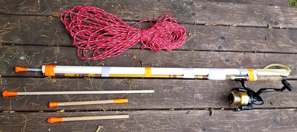 After deciding that a tree climber was probably not the best idea I decided on my next best option: go back and Google; “How to get a drone stuck in a tree out?”, and the first video that popped up was from these model rocket guys: USWaterRockets https://www.youtube.com/watch?v=nOY0dvRI7oI that showed how to build a type of drone rescue spear gun, with some PVC pipe, a fishing reel, latex tubing, some wooden dowels for projectiles along with a rope. The only things I didn’t have was the latex tubing and a long enough rope, so I ordered the tubing on Amazon Prime and prayed that it would get here before the rain did. I actually went back and tried the technique learned in the YouTube Video with a wrist rocket and my fishing pole (casting a weight over the branch) instead of the PVC spear gun but neither of these options worked that well, mainly because the weight wouldn’t drop out of the canopy, and if I added more weight it wouldn’t go high enough or was too hard to control/cast in the thick forest, so although I came close I figured I would have to wait for the latex tubing to build the spear gun. Well the latex tubing arrived the next day and I had already built the main part of the drone rescue spear gun and got some dowels and rope at Fred Meyer’s (my local grocery store), so I put everything together and headed back to the drone stuck in the tree for a second attempt at a rescue.